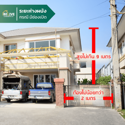 - อาคารที่มีความสูงไม่เกิน 9 เมตร ที่เว้นว่างอาคารที่มีหน้าต่าง ประตู ช่องระบายอากาศ ช่องแสงหรือระเบียงอาคาร จะต้องห่างกับเขตที่ดิน อย่างน้อย 2 เมตร