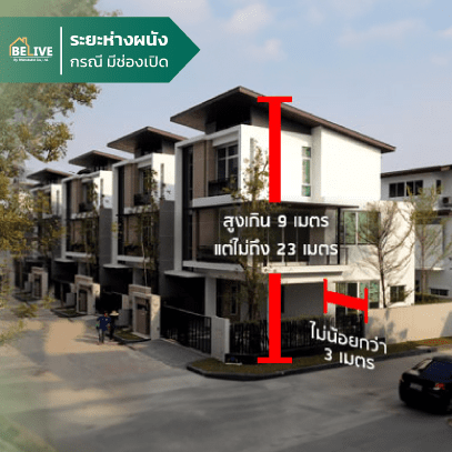 - กรณี อาคารที่มีความสูงเกิน 9 ม. แต่ไม่เกิน 23 ม. จะต้องเว้นว่างอาคารที่มีช่องเปิด อย่างน้อย 3 เมตร