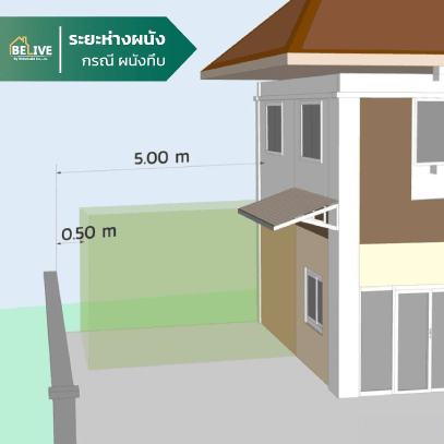 - กรณีผนังทึบ สามารถเว้นระยะห่างจากแนวเขตที่ดิน ได้อย่างน้อย 50 เซนติเมตร *ยกเว้น เจ้าของพื้นที่ข้างเคียงมีหนังสือยินยอมให้สร้างได้ จึงสามารถสร้างชิดได้น้อยกว่า 50 ซม.
