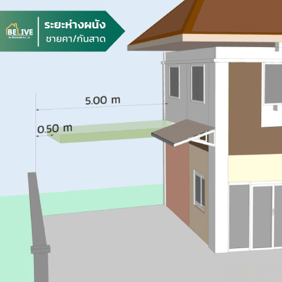 - ระยะห่างของชายคา/กันสาด จะต้องห่างจากแนวเขตที่ดินไม่น้อยกว่า 0.5 เมตร เท่ากับกรณีผนังทึบ