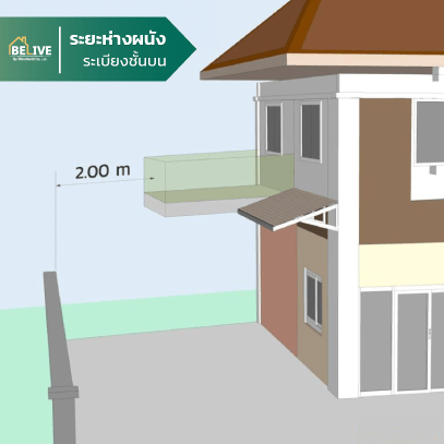 - หากต้องการต่อเติมระเบียงชั้นบน จะต้องเว้นระยะจากระเบียงถึงแนวเขตที่ดิน ไม่น้อยกว่า 2-3 เมตร เท่ากับกรณีต่อเติมผนังที่มีช่องเปิด ตามความสูงของอาคาร