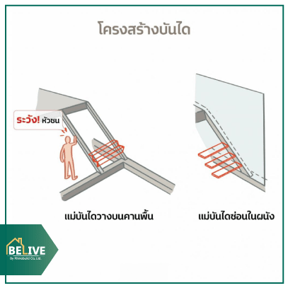 - ใช้คานพื้นชั้นบนกับชั้นล่างเป็นแม่บันได และติดตั้งขั้นบันไดตามที่ต้องการ