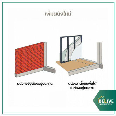- ถ้าต้องการเพิ่มผนังในส่วนที่ไม่มีคานพื้น คุณควรเลือกใช้ผนังเบา เช่น ผนังโครงคร่าว ผนังกรุวัสดุแผ่น เพราะมีน้ำหนักเบา จึงไม่จำเป็นต้องมีคานพื้นรองรับน้ำหนัก