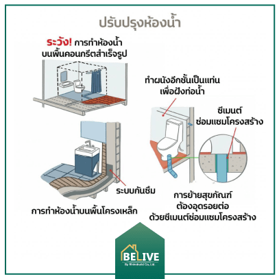 - หากต้องการทำห้องน้ำบนโครงสร้างเหล็ก จะต้องให้ความสำคัญกับระบบกันซึม เพื่อป้องกันน้ำซึมตามขอบมุม ส่งผลให้เกิดสนิมและความเสียหายต่อโครงสร้างเหล็ก