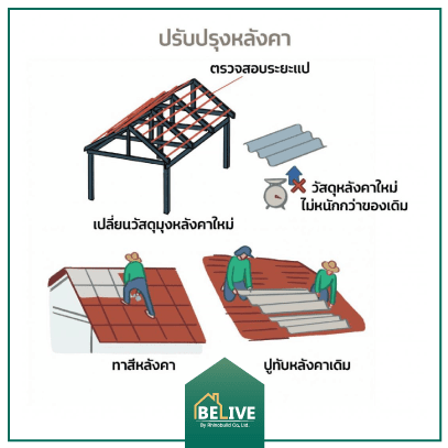 - เปลี่ยนวัสดุมุงหลังคาใหม่ วัสดุมุงหลังคาใหม่ควรมีน้ำหนักน้อยกว่าหรือเท่ากับวัสดุเดิม สามารถมุงแนวลาดชันได้ และมีระยะแปสำหรับติดตั้งกระเบื้องมุงหลังคาเท่าเดิม